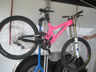 She Tried Down Hill. Not only did she try it for the first time. She was the 1st woman on the East Coast to ride the Prototype Turner DHR w/ DW Link. She got so lucky b/c Dave Weagle was under our umbrella walking back to the pits in the rain after the giant slalom finals and convinced her to try out his new bike.